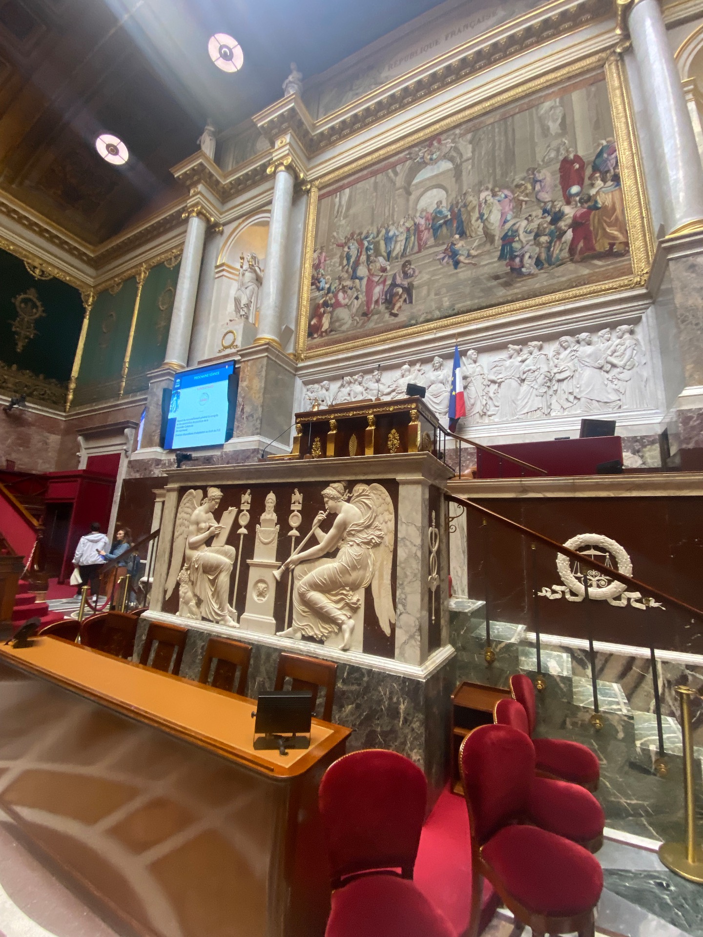 On the right side of the room, there is a large desk for the president of the deputies, with a white mural showing figures in the background, representing the first sessions of the former assembly. A golden lettering reading "French Republic" on the top; it shows the sovereignty of the people.